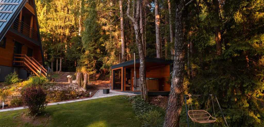 Zunanji del namestitve se nahaja sredi gozda in ponuja parkirni prostor, teraso, vročo kad – hot tub in zasebno zunanjo savno. V Pohorski gozdni vili boste našli mir, razkošje in stik z naravo, ki bo napolnil vašo energijo ter ustvaril nepozabne spomine.